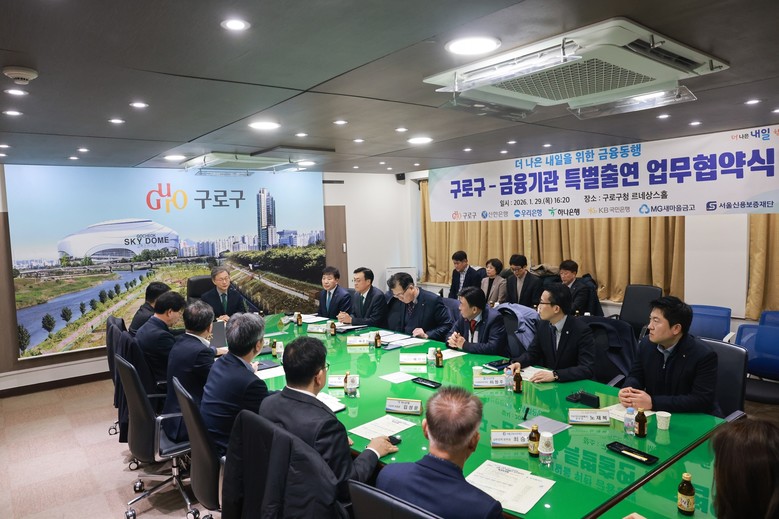 [구로구 세계타임즈=이장성 기자] 구로구(구청장 장인홍)가 1월 29일 구청 3층 르네상스홀에서 신한은행, 우리은행, 하나은행, 국민은행, 새마을금고, 서울신용보증재단과 ‘더 나은 내일을 위한 금융동행’ 특별출연 협약을 체결하고, 총 212억 5천만 원 규모의 중소기업·소상공인 특례보증을 추진한다.