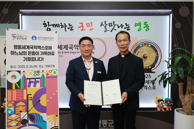 [충북 세계타임즈=이현진 기자] 2025영동세계국악엑스포 조직위원회(공동조직위원장 김영환 충북도지사, 정영철 영동군수)는 천주교 청주교구(교구장 김종강 시몬주교)와 지난 8월 26일(화) 영동군청에서 2025영동세계국악엑스포(이하 국악엑스포)의 성공 개최를 위한 업무 협약을 체결했다고 27일 밝혔다.