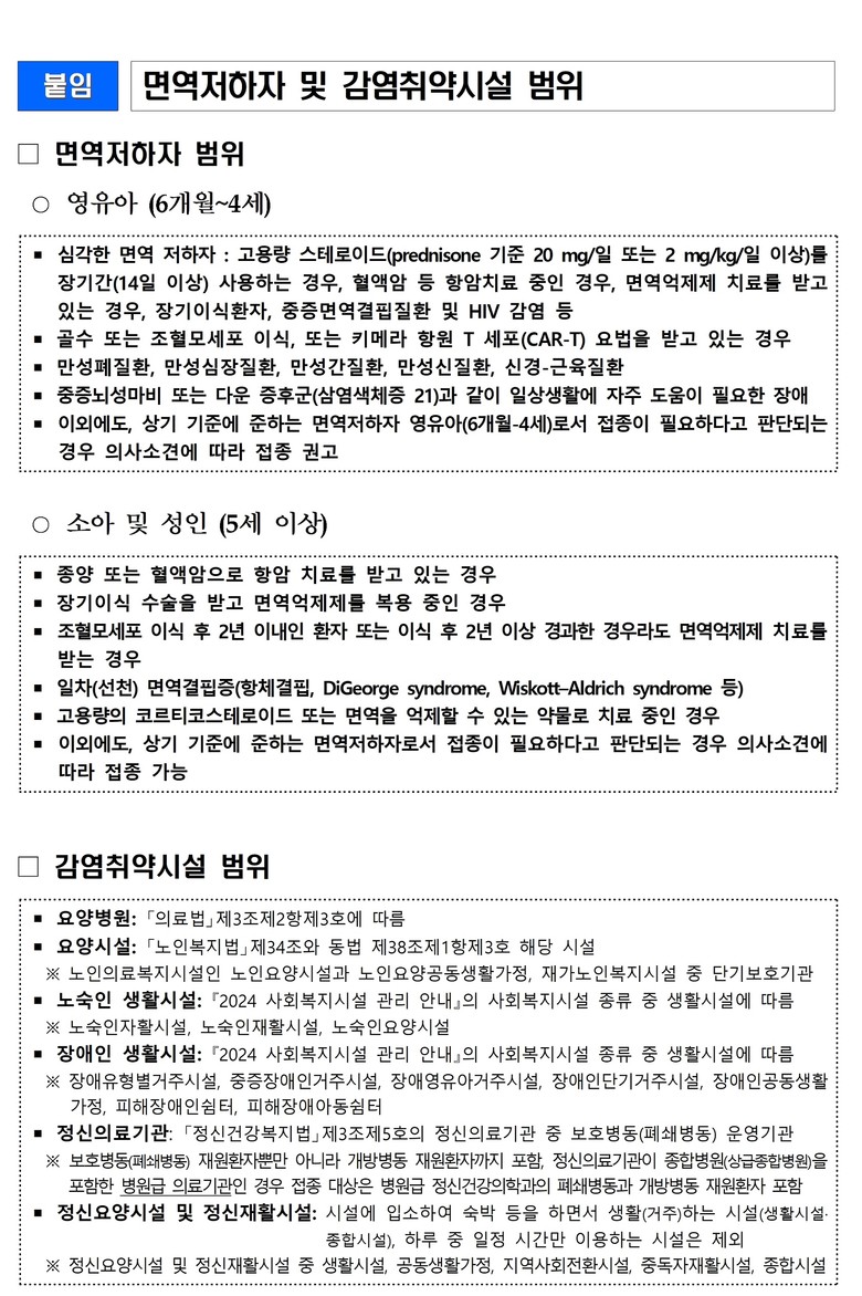 또한, 이미 ’24-’25절기 백신을 접종한 고위험군도 코로나19 백신 접종 후 시간 경과에 따른 면역감소를 고려해 의료진과의 상담을 통해 한 번 더 접종할 수 있으며, 특히 면역저하자는 면역 형성이 어려운 점을 감안하여 추가접종을 적극 권고한다.