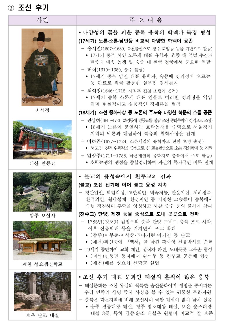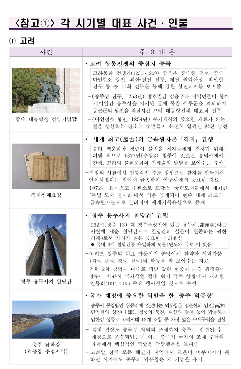 또한, 다양한 학맥과 학풍의 꽃을 피운 충북의 유교문화. 세계에서 가장 오래된 금속활자 「직지」를 탄생시킨 충북의 불교문화 등 충북 문화의 우수성을 살펴봄을 통해 충북의 자긍심을 높일 수 있는 내용이 잘 정리되어 있다.