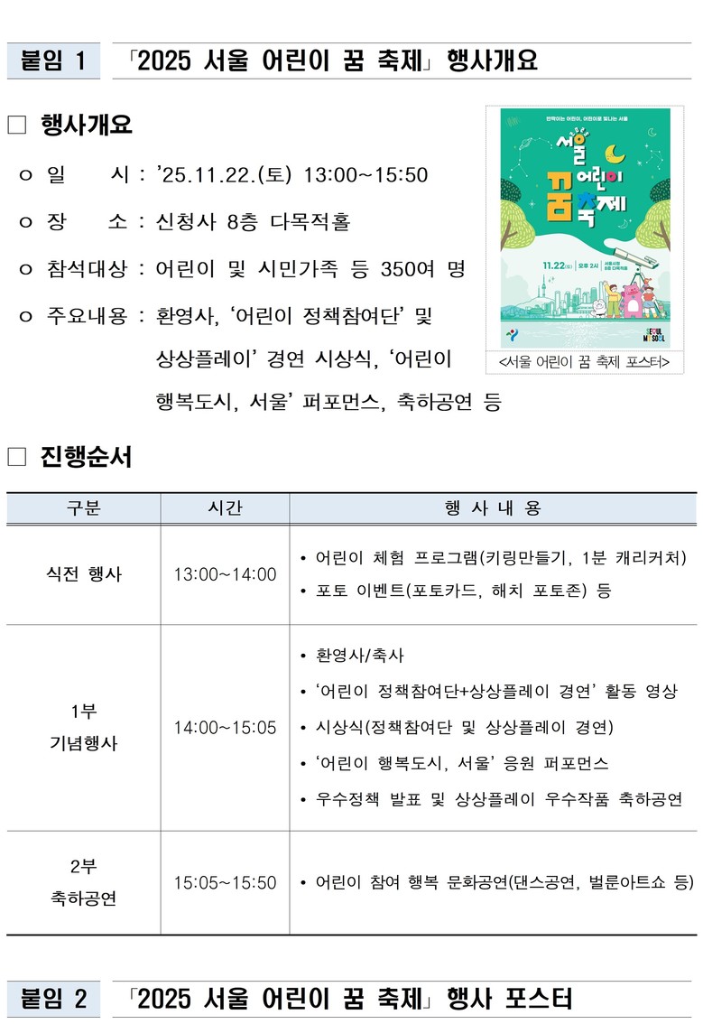 올해 행사는 어린이 스스로 정책을 발굴‧제안하는 ‘서울 어린이 정책참여단’과, 어린이의 상상력으로 만드는 퍼포먼스 경연 ‘상상플레이’에 참여한 어린이와 가족 등 350여 명이 함께한다.