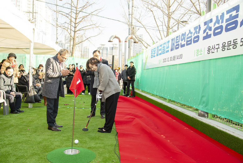 | ▲ 12월 30일 용문 파크골프 퍼팅연습장 준공식에 참석한 박희영 용산구청장이 시타를 하고 있다 |