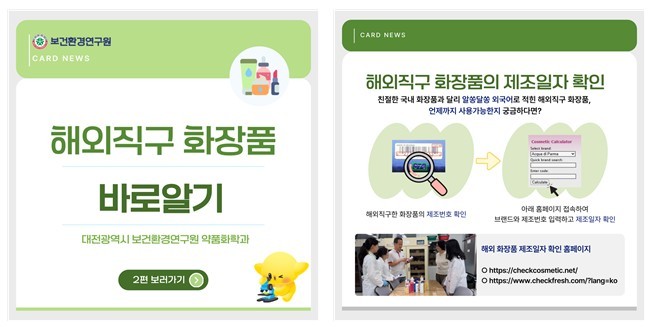 연구원은 누구나 쉽게 결과를 확인할 수 있도록 ‘시정 카드뉴스’, ‘시밴드’, 연구원 홈페이지 등 다양한 채널로 안내할 계획이다. 아울러 해외 화장품 제조일 확인 방법 등 실생활에 유용한 정보도 함께 제공한다.