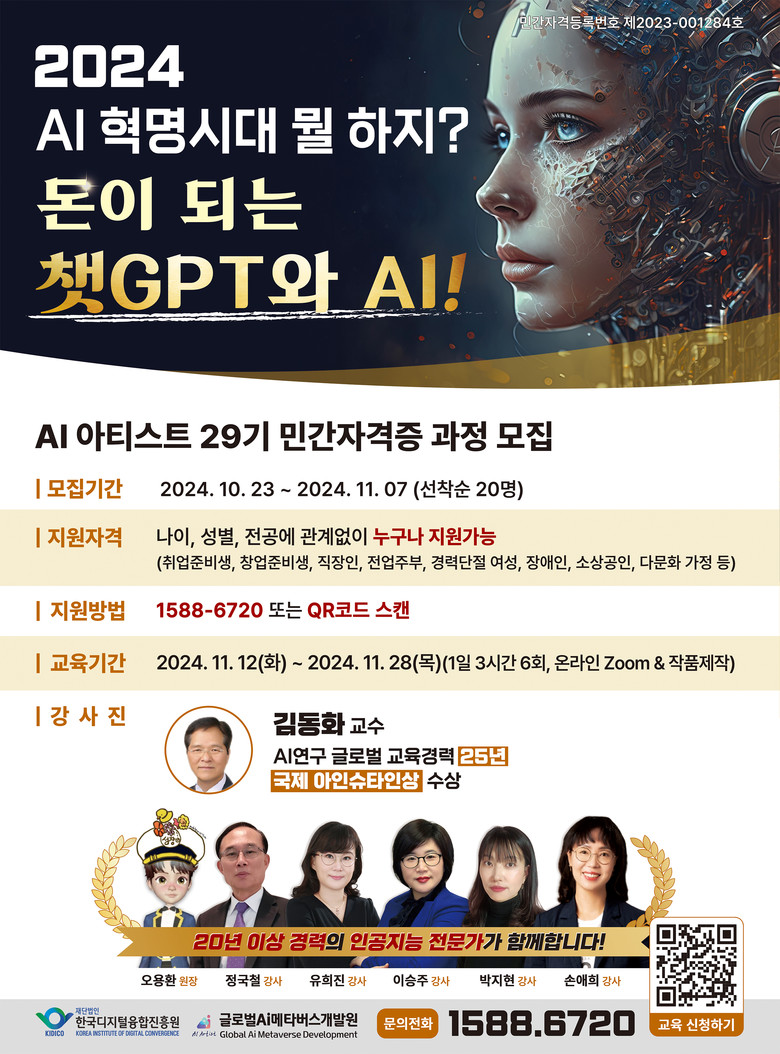한편 한국디지털융합진흥원의 AI 아티스트 29기 과정은 AI 기술을 배우고 경제적 자유를 얻을 수 있는 방법을 탐색하는 과정으로 이번 과정을 통해 AI 시대의 주인공이 되고, 더 나은 미래를 향한 도전에 참여하실 분은 이래 1588-6720으로 문의하시거나 한국디지털융합진흥원 및 글로벌AI메타버스개발원 홈페이지를 방문하시면 된다.