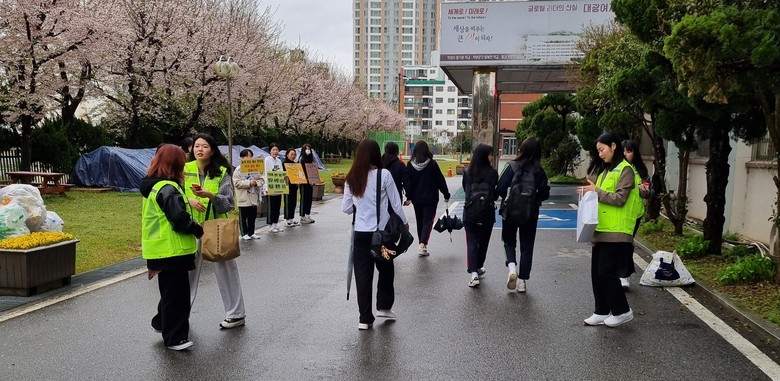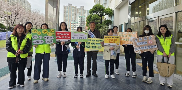 특히 “친구야! 내가 손잡아 줄게”, “힘들 땐 1388”을 외치며 밝은 미소로 교직원 및 학생들을 맞이하는 또래상담부 동아리 학생들의 힘찬 목소리는 교내 생명 존중 문화 조성에 기여할 것으로 보인다.