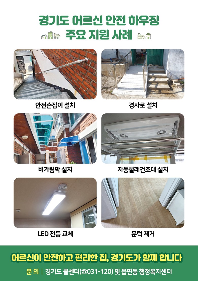 김태수 경기도 주택정책과장은 “어르신들의 안전한 생활을 위해 더욱 세심한 맞춤형 개보수를 추진할 계획”이라며, “어르신들이 살던 곳에서 안심하고 노후를 보낼 수 있는 주거환경을 조성하는데 최선을 다하겠다”고 말했다.