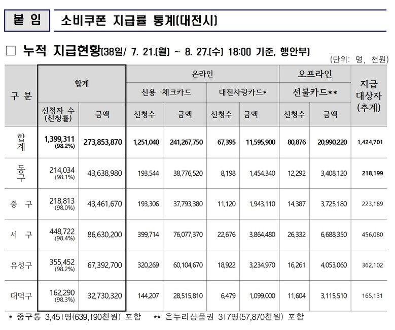 [대전 세계타임즈=이채봉 기자] 대전시는 지난 27일 오후 6시 기준, 민생회복 소비쿠폰 대전지역 1차 지급 신청률이 98.2%에 달했다고 29일 밝혔다.