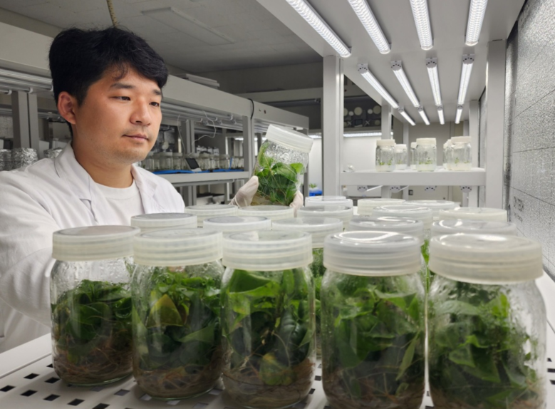 | ▲ 덩굴모밀 배양묘와 산림바이오센터 연구원 |