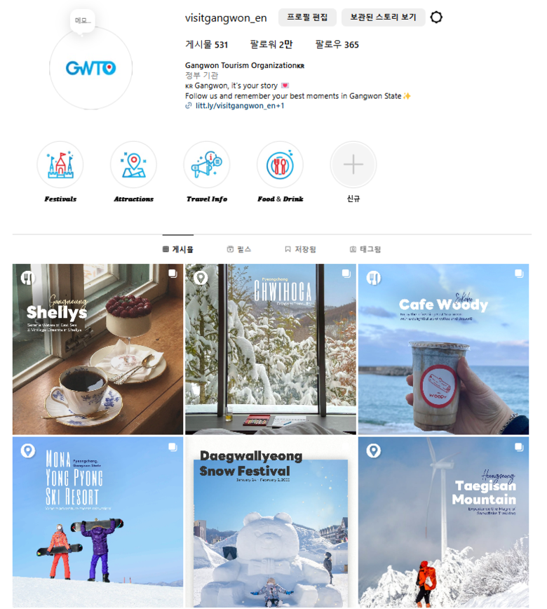 재단은 외국인 팔로워 및 잠재 관광객에게 강원 관광을 효과적으로 홍보하기 위해 다양한 콘텐츠를 활용하여 SNS를 운영해 왔다.