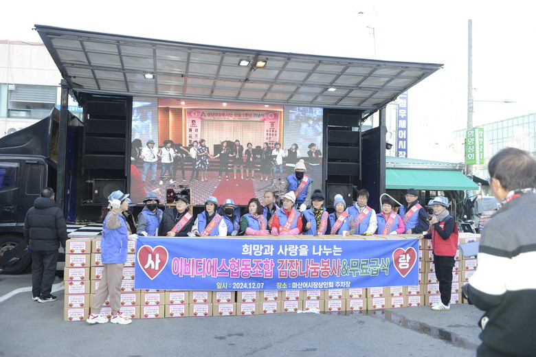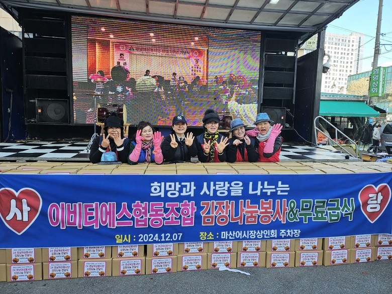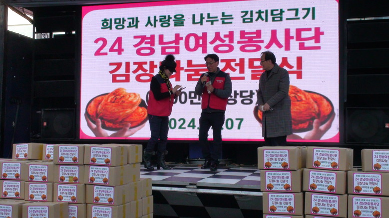 [세계타임즈]최성룡기자 ='경남여성봉사단(회장 이수진) 주최하고 한우리 국민 밥상이 주관하는 희망과 사랑을 나누는 김치담그기와 김장 나눔 전달식 행사가 12월 7일 마산어시장 상인회 주차장에서 실시했다.
