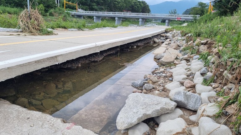 그러나 두 달이 넘도록 시는 어떠한 조치도 하지 않았고 결국 이번 집중호우에 도로를 지지하던 자갈층이 유실되면서 도로 구조물만 덩그러니 떠 있는 위험천만한 상태가 됐다.