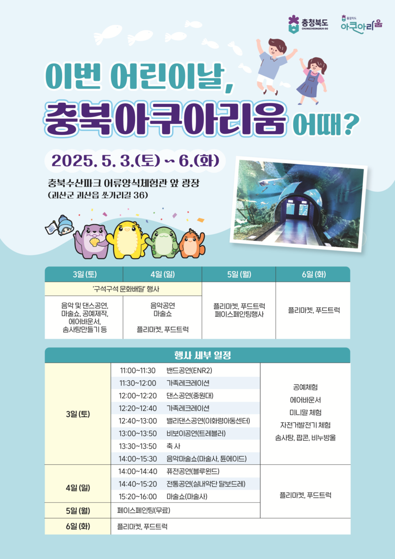 충북아쿠아리움에서는 공연, 마술쇼, 공예 등 다채로운 체험 활동이 마련돼 어린이들에게 특별한 경험을 제공한다.