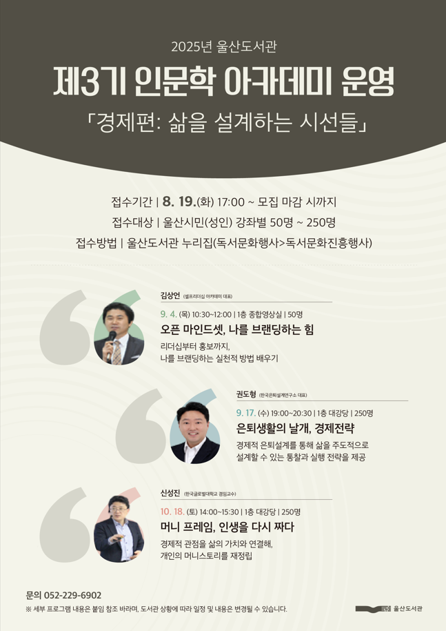 경제 분야는 ‘삶을 설계하는 시선들’을 주제로 ▲9월 4일 김상언 저자의 ‘오픈 마인드셋, 나를 브랜딩하는 힘’을 시작으로 ▲9월 17일 권도형 저자의 ‘은퇴생활의 날개, 경제전략’ ▲10월 18일 신성진 저자의 ‘머니 프레임, 인생을 다시 짜다’ 등 3개 특강이 진행된다. 이 특강들은 삶의 방향과 가치를 주체적으로 설계하고 준비할 수 있도록 돕는 내용을 다룬다.