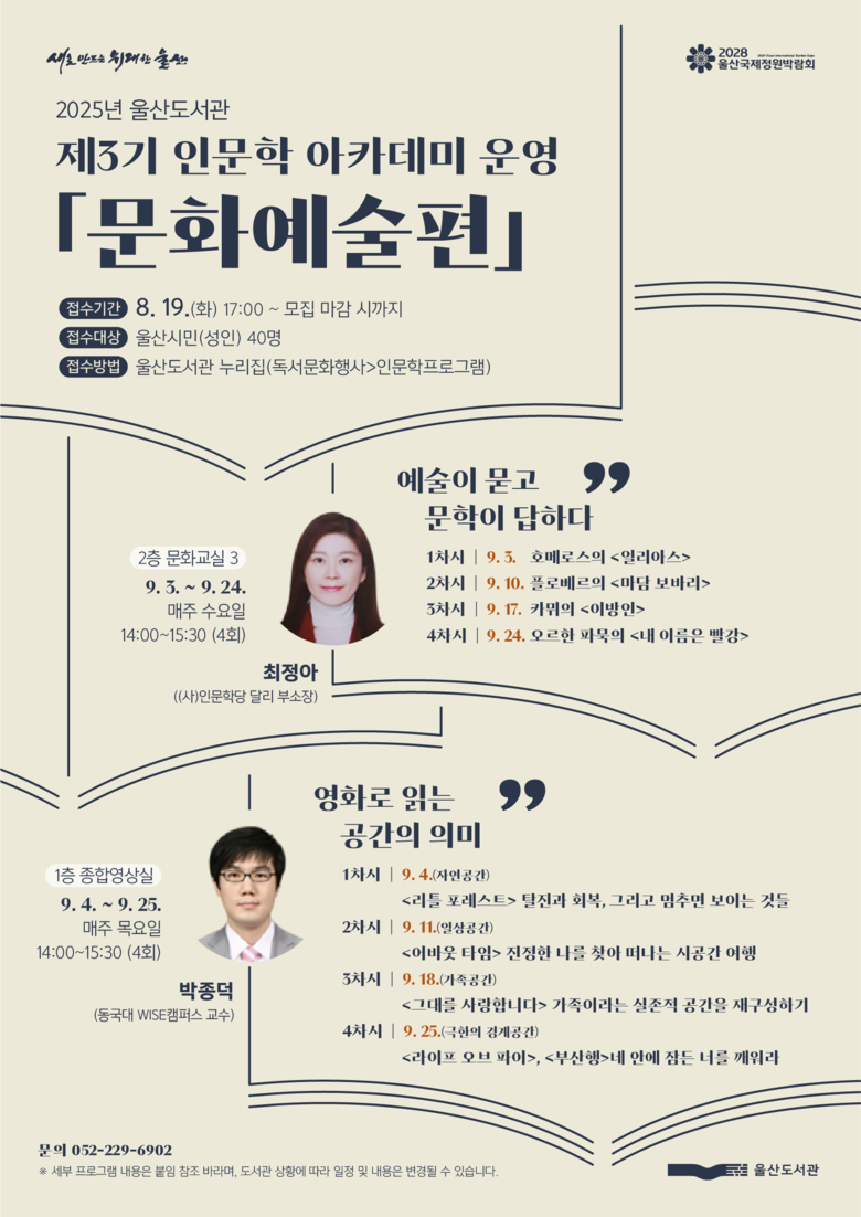 19일부터 울산도서관 누리집서 선착순 접수 [울산 세계타임즈=이호근 기자] 울산도서관은 오는 9월부터 ‘2025년 제3기 인문학 아카데미’ 문화예술편과 경제편 강좌를 운영한다고 밝혔다.