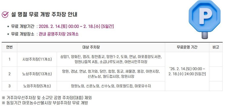 아울러 망원·아현·연남·합정·동교·용강·월드컵시장·망원시장 등 주요 생활권과 전통시장 인근 주차장이 다수 포함돼, 설 명절 장보기와 지역 방문이 보다 편리해질 것으로 보인다.