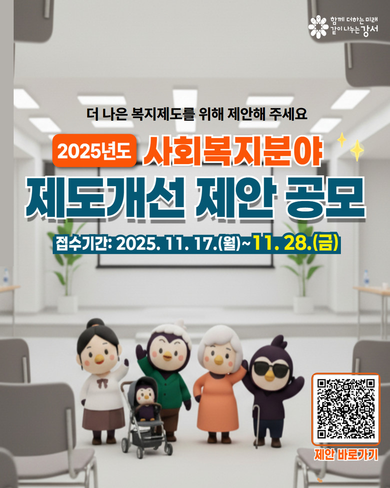 오는 28일(금)까지 전자우편 또는 QR코드 온라인 서식 작성 제출 [강서구 세계타임즈=이장성 기자] 서울 강서구(구청장 진교훈)는 오는 28일(금)까지 ‘2025년 사회복지분야 제도개선 제안 공모’를 진행한다고 밝혔다.