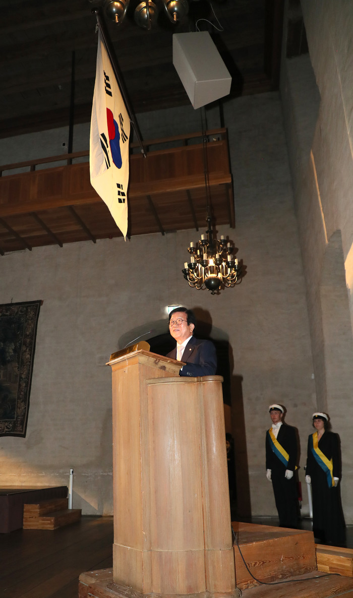 박 의장은 만찬사에서“이곳에서 미래를 창조하는 스웨덴을 다시 봤다. 대한민국과 스웨덴이 4차 산업혁명과 디지털 바이오 혁명을 함께 이뤄가는 파트너가 될 것”이라고 말하고 “우리는 사회적 거리두기를 하고 있지만 외교적 거리는 더 좁혀야 하고 마음은 더욱 가까워져야 한다”며 양국의 우호 증진을 강조했다.