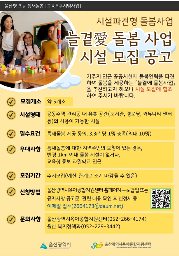 울산시 관계자는 “올해 시정 핵심과제 일환으로 진행되는 ‘울산형 초등 틈새돌봄 시설파견형’ 늘곁애(愛) 사업 추진을 위해 상반기 내 시설을 추가 모집할 것”이라며, “본격적인 서비스가 이뤄질 수 있도록 많은 관심과 참여를 바라며, 기존 유아에서 초등에 이르는 울산형 아이돌봄 체계도 내실을 높여가겠다”라고 말했다.