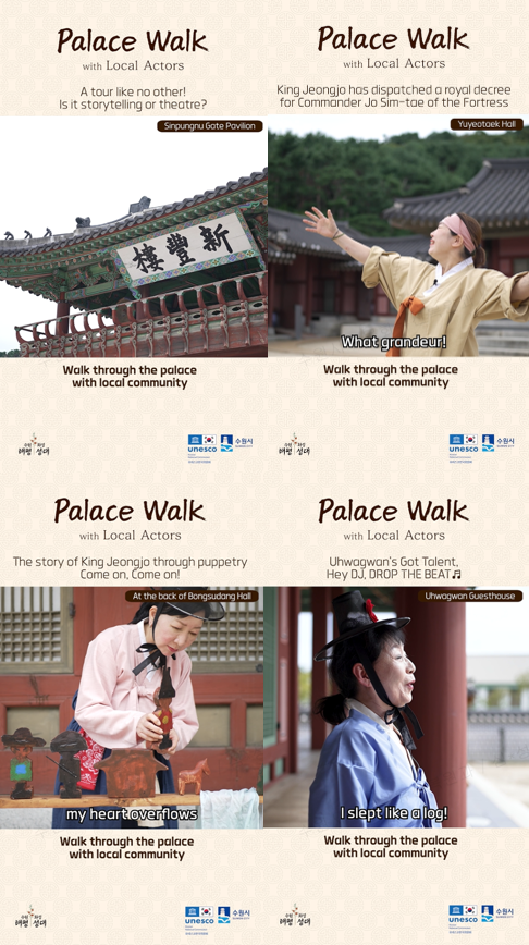 지난 5일 ‘고궁산책’이 진행되는 화성행궁의 네 공간에 관한 이야기를 소개하는 영상을 수원시 공식 유튜브 채널에 공개했고, 12일에는 ‘다과 체험’ 네 가지 음식이 가진 의미와 조리 과정을 공개했다. 한국어판은 수원문화재단 공식 SNS에 차례대로 게시할 예정이다.