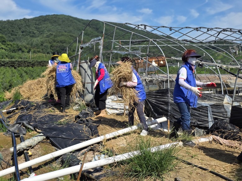 이날 조합원들은 물에 떠내려와서 처박힌 짚뭉치. 포크레인으로 할수도 없는현장 우리는 낫으로 쫓고 뜯어내 옮기는 작업,하우스. 밑부분에 깔려있는 비닐 벗겨내기 흐르는 땀에 눈이아프고,허리도,다리도 팔도 아프고 힘들었지만 누군가의 고통을 함께 나누고, 어려운 이웃을 돕는 일에 힘든일도 마다하지 않았다.