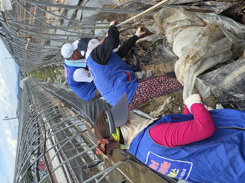 이들은 장화,장갑,모자,갈아입을 옷등을 챙겨 창원시자원봉사자들과함께 버스를 탑승해 산청 수해복구현장으로 달려갔다. 이날은 튿히 그늘 한곳없는 뙤약볓에 산청군의 침수 피해 비닐하우스에 이집 저집으로 나뉘어 작업을 시작했다.