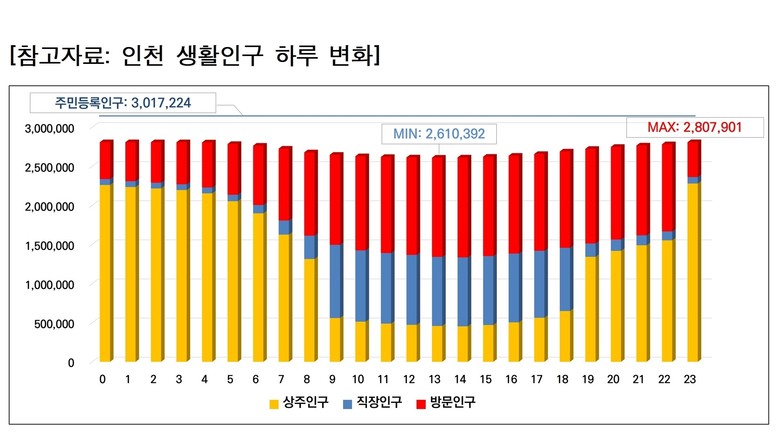 이는 단순히 몇 명이 인천에 살고 있는지를 넘어서, 어느 시간대에, 어떤 목적(상주.직장.방문)으로, 어느 지역에 사람들이 머무르는지를 입체적으로 파악하기 위한 것으로 도시의 리듬과 밀도를 구체적으로 보여준다.