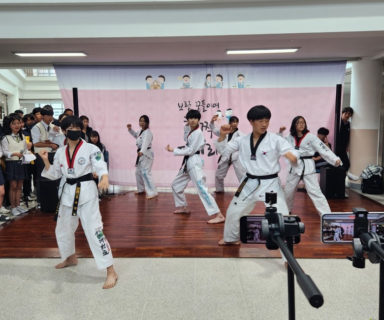 | ▲ 보람중학교 학생들이 대만 학생 방문 환영의 의미로 태권도 공연을 하고있다. |