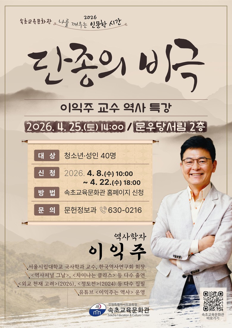 이중 첫 번째 인문학 강연은 4월 25일(토) 오후 2시 문우당서림에서 열린다. 서울시립대학교 국사학과 교수이자 한국역사연구회 회장인 이익주 교수가 ‘단종의 비극’을 주제로 강연하며, 우리가 익숙하게 알고 있던 단종의 이야기를 역사적 맥락 속에서 새롭게 들려줄 예정이다.