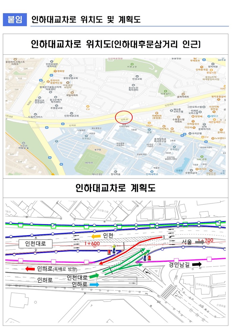 이번에 개통되는 인하대 교차로는 시민의 교통편의를 위해 공사 중 교통처리계획에 따라 우선 개방하는 시설로, 향후 인천대로 일반화 사업 추진 단계에 따라 재정비될 예정이다.