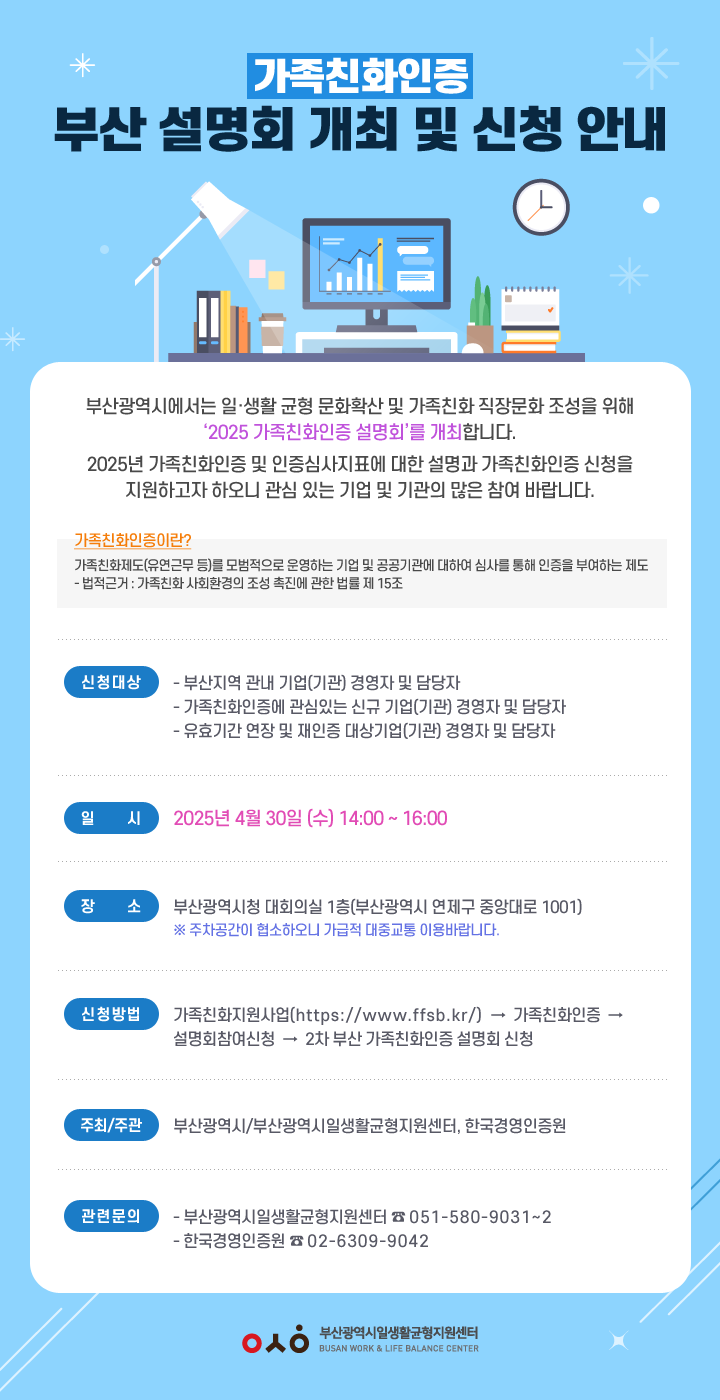 ◈ 설명회는 4.30. 14:00 시청 대회의실에서 열려… 사전 신청은 가족친화지원사업 누리집에서 할 수 있으며 [부산 세계타임즈=이용우 기자] 부산시(시장 박형준)는 가족친화인증사무국(한국경영인증원)과 함께 개최하는 '2025년 가족친화인증 설명회'에 참가할 기업과 기관을 오는 4월 29일까지 모집한다고 밝혔다.