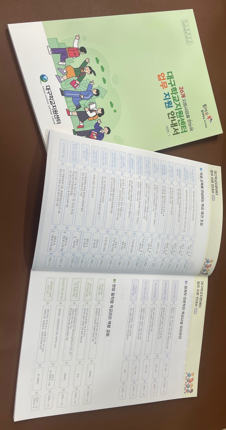 - 학교 지원 26개 사업 「업무지원 안내서」 발간 - [대구 세계타임즈=한윤석 기자] 대구교육청 산하 대구학교지원센터(단장 박정희, 이하 센터)는 2026년 새 학기를 맞아 학교 현장의 행정업무 부담을 줄이고 교육활동에만 전념할 수 있도록 지원사업을 대폭 강화한다. 센터는 현장 수요가 높은 기존 사업의 지원대상 등을 확대하는 한편, 4개의 신규사업을 추가로 도입하여 학교 현장을 밀착 지원할 계획이다.