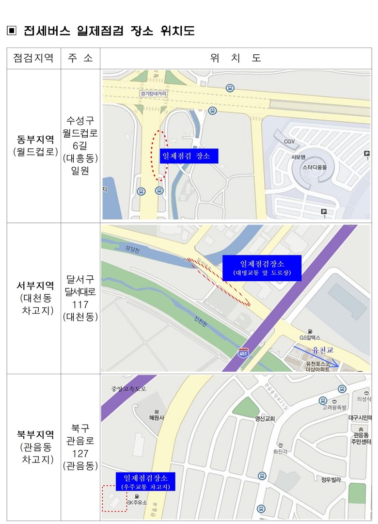 점검은 전세버스 업체의 수검 편의를 위해 동부지역(월드컵로), 서부지역(대천동 공영차고지), 북부지역(관음동 공영차고지) 등 3개 권역으로 나눠 실시한다.