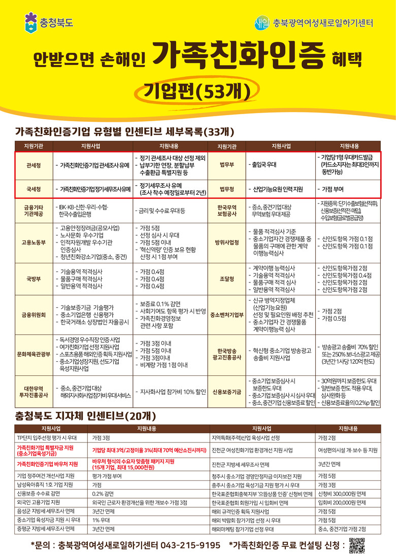 - 가족친화인증기업 혜택 늘어나, 중소기업 세무조사 ‧ 관세조사 유예 등 - [충북 세계타임즈=이현진 기자] 충북도는 2025년 올해를 가족친화인증 500+ 사업*의 확산기로 삼고, 우리 도내 가족친화제도를 모범적으로 실천하고 있는 기업을 적극 발굴해 여성가족부 인증을 받을 수 있도록 제도 설명회 및 컨설팅 지원에 적극 나선다. *가족친화인증 기업 확대(361개 사 → 500개 사 이상 인증)