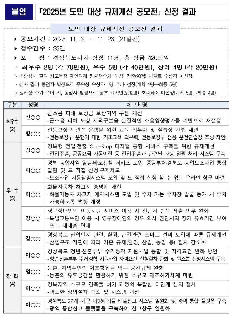양금희 경제부지사(경상북도 규제개혁위원회 위원장)는 “이번 공모전을 통해 도민들이 느끼는 어려움과 고민을 확인할 수 있었다”며 “현장의 목소리에 귀 기울여 발굴한 소중한 아이디어는 단순 제안에 그치지 않고 실제 정책과 제도 개선으로 이어지도록 적극 검토하겠다”고 밝혔다.