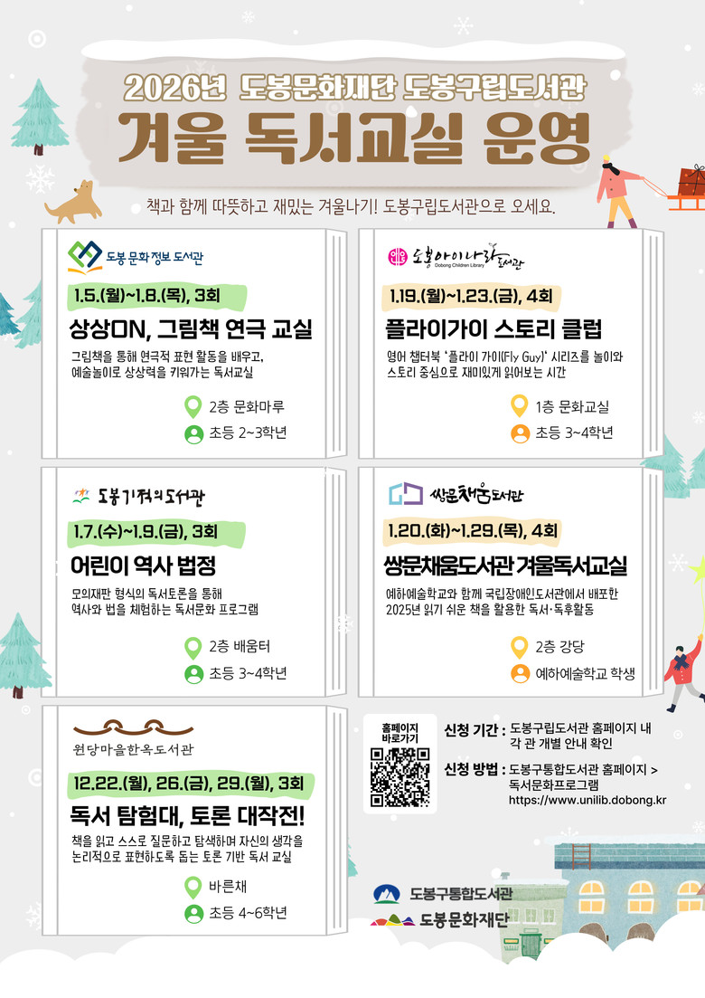 도서관별 프로그램 참여 방법 등은 도봉구통합도서관 누리집에서 확인 가능하다. 쌍문채움도서관에서 운영하는 ‘쌍문채움도서관 겨울독서교실’은 별도 모집없이 예하예술학교 학생들과 진행한다.