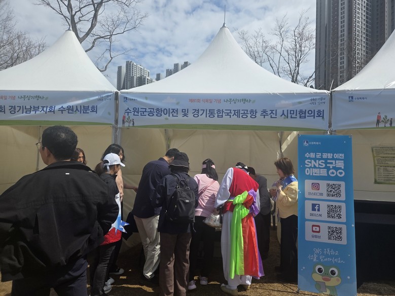 [수원 세계타임즈 = 송민수 기자] 수원군공항이전 및 경기통합국제공항 추진 시민협의회(회장, 조철상, 이하 시민협의회)는 지난 3월31일 ‘제81회 식목일기념 나무심기 행사’에서 군 공항 이전 및 경기국제공항 건설을 촉구하는 10만 서명운동 홍보 부스를 운영하며 시민들과 적극적으로 소통하고 공감대를 형성하였다.