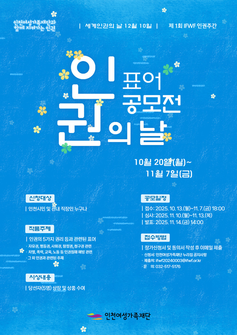 인권 표어 공모전 신청서는 인천여성가족재단 누리집(www.ifwf.or.kr) ‘공지사항’에서 내려받을 수 있으며, 이메일 접수를 통해 10월 20일부터 11월 7일까지 접수할 수 있다.