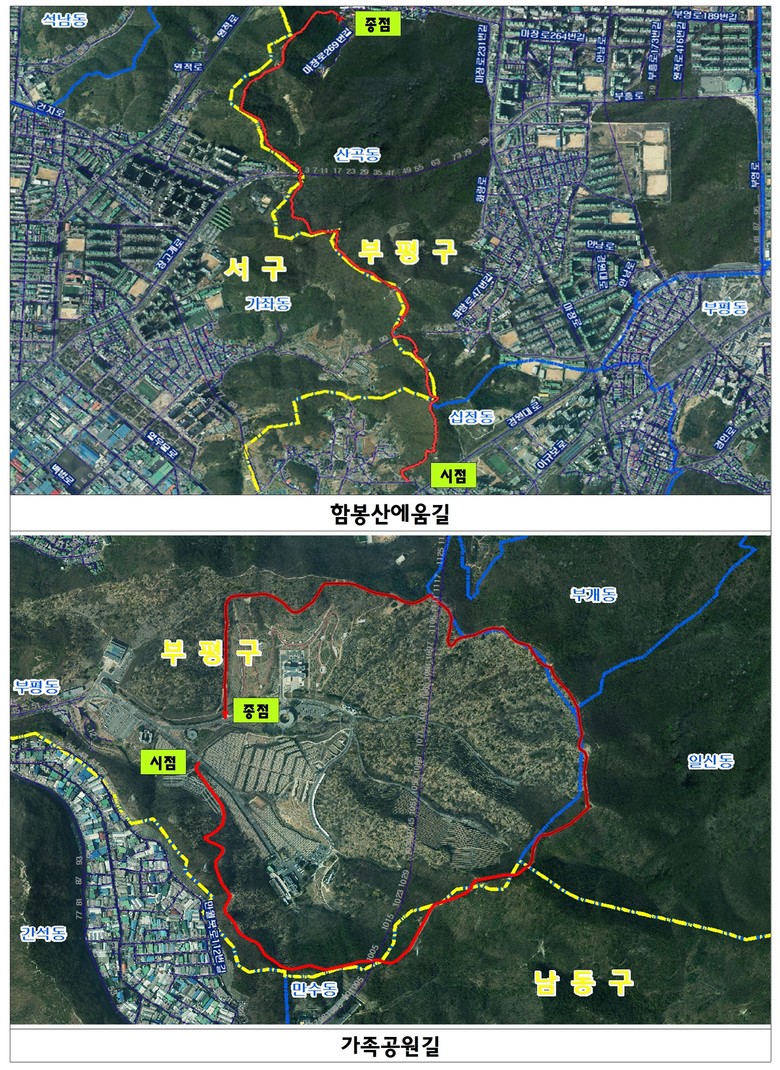 이번에 확정된 도로명은 ‘계양산에움길’, ‘천마산에움길’, ‘함봉산에움길’, ‘가족공원길’이다. 특히 산책로와 둘레길의 특성을 살려 ‘굽이져 돌아가는 길’을 의미하는 순우리말 ‘에움길’을 접목한 것이 특징이다.