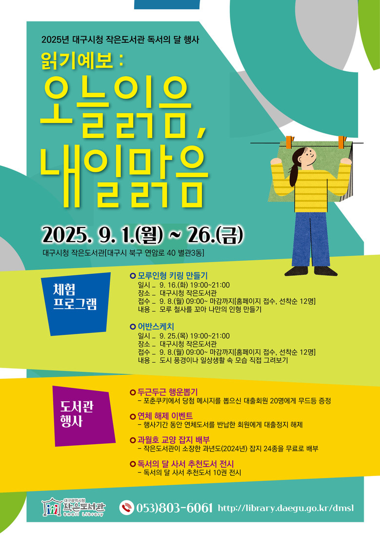 이 밖에도 연체자 해제 이벤트, 과월호 교양 잡지 배부, 사서 추천도서 전시 등 다양한 행사가 마련된다. 자세한 사항은 대구시청 작은도서관(☏ 053-803-6061)으로 문의하거나, 대구시청 작은도서관 홈페이지를 참고하면 된다.