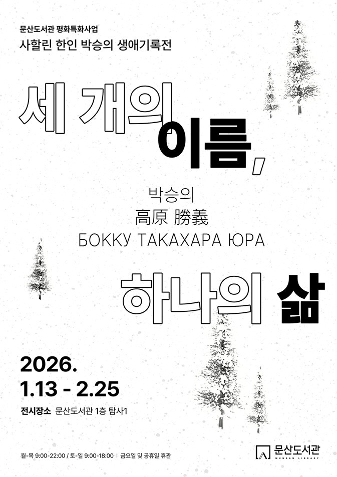 이인숙 문산도서관장은 “세 개의 이름으로 이어진 한 사람의 삶을 통해, 지역사회가 공존의 의미를 새롭게 바라보는 자리가 되길 바란다”라며 “문산도서관이 서로 다른 기억을 가진 이웃들을 잇고 소통하게 하는 평화의 공간이 되길 바란다”라고 말했다.