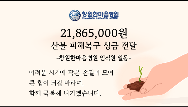 이번 성금은 창원한마음병원 임직원들이 자발적으로 뜻을 모아 마련한 것으로, 성금 규모는 총 21,865,000원이다. 십시일반 모금한 성금은 산불 피해로 삶의 터전을 잃은 주민들의 신속한 복구와 생계 지원을 위해 희망브리지 전국재해구호협회를 통해 전달될 예정이다.