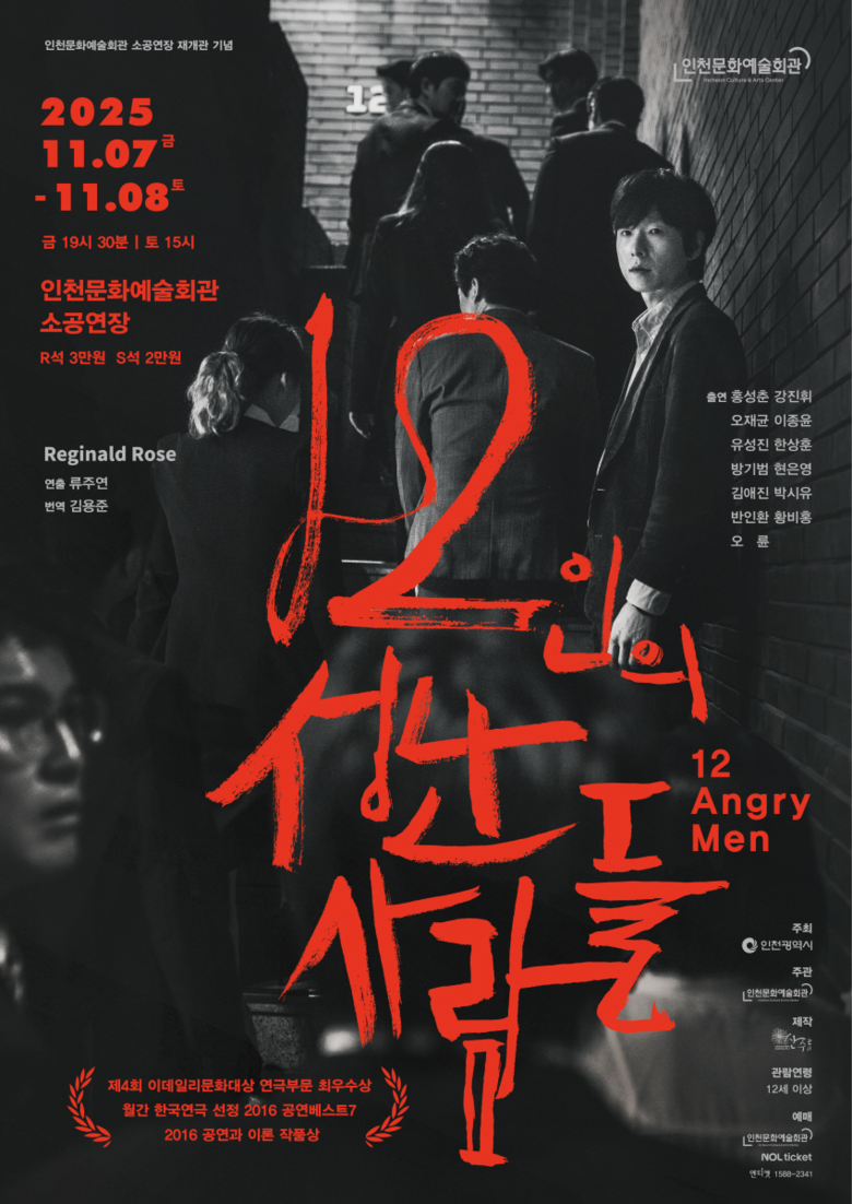 1954년 미국의 각본가 레지널드 로즈(Reginald Rose)가 쓴 고전 법정 드라마를 원작으로 한 <12인의 성난 사람들>은 이듬해 연극 무대로 옮겨져, 긴밀한 공간 구성과 대사만으로도 숨 막히는 드라마를 완성했다. 류주연 연출의 극단 산수유 버전 <12인의 성난 사람들>은 밀실과도 같은 배심원실을 한 치의 틈도 허락하지 않는 긴장감으로 채우며 ‘나는 과연 편견에서 자유로운가?’, ‘우리는 민주주의를 온전히 이해하고 실천하고 있는가’라는 질문을 관객 앞으로 돌려놓는다.