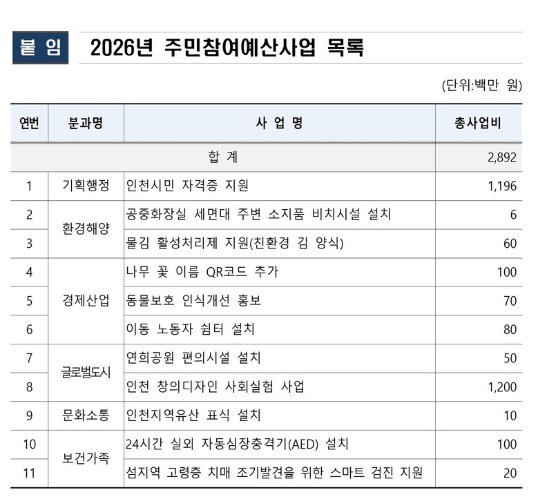 주민참여예산제도는 주민이 직접 예산편성 과정에 참여해 필요한 사업을 제안하고 의견을 반영하는 제도다. 이번에 선정된 사업들은 시 의회 심의를 거쳐 오는 12월 최종 확정되며, 결과는 인천시 누리집을 통해 공개될 예정이다.
