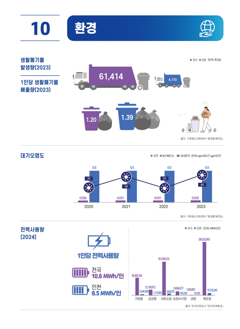 환경 분야에서는 녹지환경(3.58점), 수질(3.55점), 토양(3.49점) 등 환경 체감도가 전반적으로 개선됐으며, 인천시 녹지율은 56.8%로 전국 평균(71.2%) 대비 14.1% p 낮은 수준으로 나타났다. 거주지역에서 가장 우선적으로 해결해야 할 과제로는 ‘주거복지’(23.6%)가 가장 높게 나타났으며, 다음으로 ‘노인복지’(22.9%), ‘청소년복지’(15.6%) 순으로 조사됐다.
