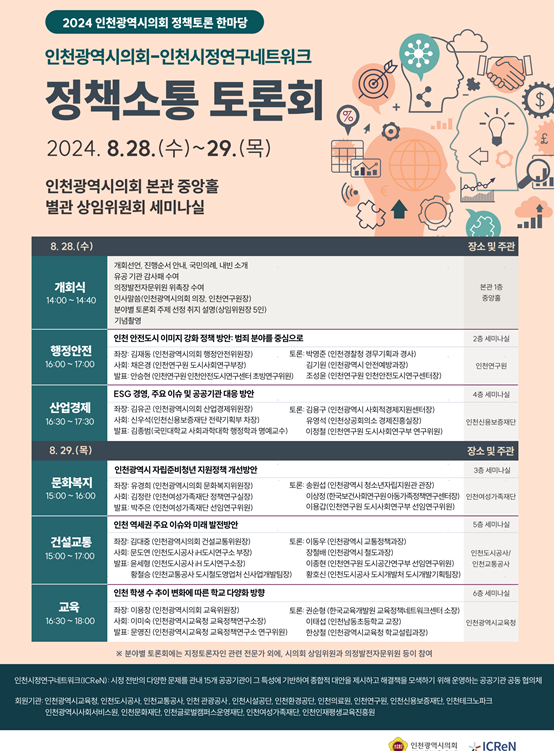 이어 본격적인 토론회는 28~29일 양일간 시의회 별관 각 위원회 세미나실에서 ▶인천 안전 도시 이미지 강화 정책 방안 ▶인천광역시 자립준비청년 지원 정책 개선 방안 ▶ESG 경영 주요 이슈 및 공공기관 대응 방안 ▶인천 역세권 주요 이슈와 미래 발전 방안 ▶인천 학생 수 추이 변화에 따른 학교 다양화 방향 등의 주제로 진행된다.
