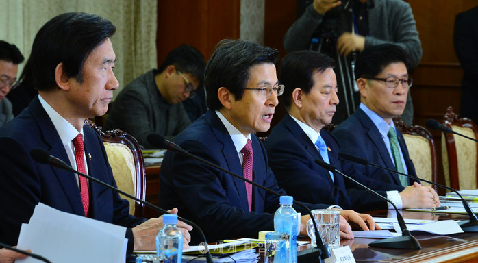 황교안 대통령 권한대행 국무총리가 2일 오전 국정현안 관련 관계 장관회의가 열린 서울 종로구 정부서울청사 대회의실에서 모두발언을 하고 있다. 황 권한대행 오른쪽은 한민구 국방부장관. 2017.02.02.