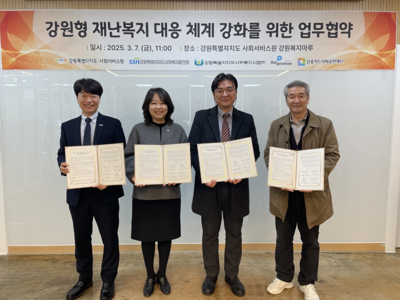 [강원도 세계타임즈=김민석 기자] 강원특별자치도사회서비스원(원장 이은영)은 3월 7일(금) 오전 11시, 사회복지협의회(회장 홍기종), 사회복지사협회(회장 진영호), 더프라미스(이사장 묘장)와 함께 「강원형 재난복지 대응 체계 강화」를 위한 업무협약을 체결했다고 밝혔다.