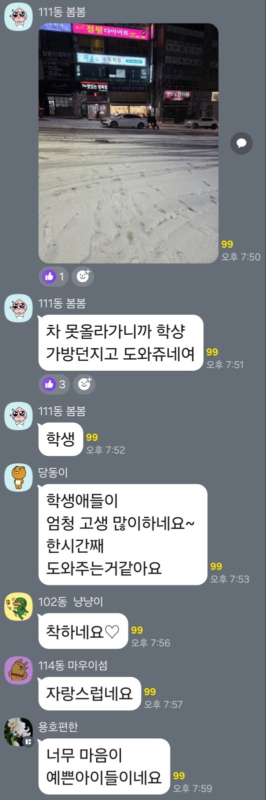 | ▲ 선행학생칭찬글이오른아파트단톡방갈무리 |