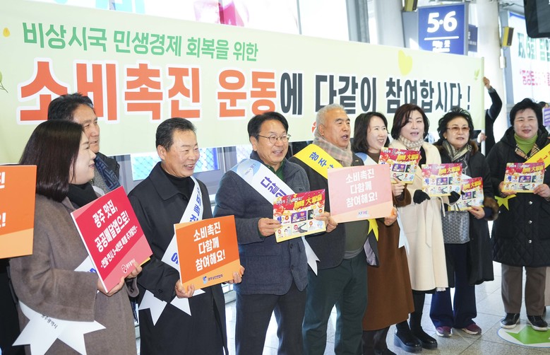 광주광역시(시장 강기정)는 광주소상공인연합회, 광주상인연합회, 광주소비자단체협의회와 함께 24일 광주송정역에서 ‘민생경제 회복 소비촉진 캠페인’에 나섰다.
