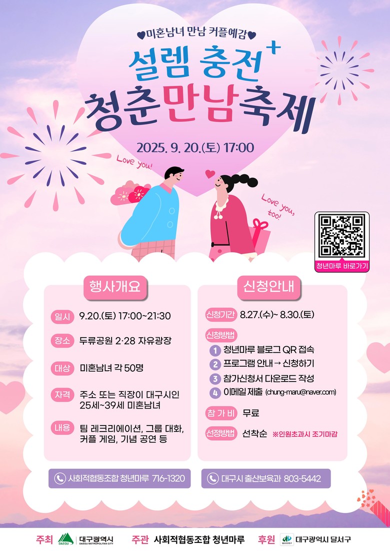 ▸ 8월 27일(수)부터 30일(토)까지 온라인 신청, 선착순 진행 [대구 세계타임즈=한윤석 기자] 대구광역시는 오는 9월 20일(토) 오후 5시, 두류공원 2.28자유광장에서 올해 미혼남녀 만남 행사의 대미를 장식할 ‘청춘 만남 축제’를 개최한다.